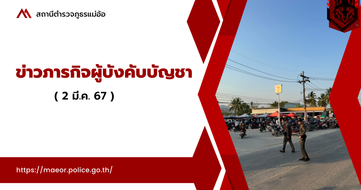 ข่าวภารกิจผู้บังคับบัญชา ( 2 มี.ค. 67 ) 03/02/2567 โดย admin / ข่าวภารกิจผู้บังคับบัญชา วันนี้( 2 มี.ค. 67 ) เวลา 08.00-15.00 น.โดยการอำนวยการของ พ.ต.ท.กิจวัฒน์สินธุ์ อมตธนทรัพย์ สวญ.สภ.แม่อ้อ พ.ต.ท ฉัตรชัย ปิ่นทอง สวป.สภ.แม่อ้อ ด.ต.เภา มหิตธิ ร้อยเวร20 พร้อมสายตรวจรถยนต์ ออกตรวจ จุดตรวจ จุดเสี่ยง จุดล่อแหลม สถานบริการปั๊มน้ำมัน สถาบันการเงิน ร้านสะดวกซื้อ แหล่งชุมชน โรงเรียน ปรากฏกายให้เห็นเด่นชัด ในพื้นที่รับผิดชอบ เพื่อป้องกันเหตุ เหตุการณ์ทั่วไปปกติ Post Views: 0 FacebookFacebookXXLINELine