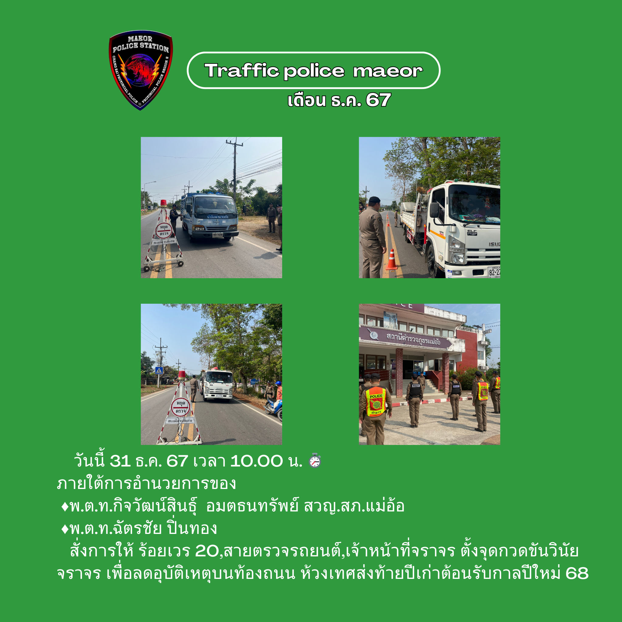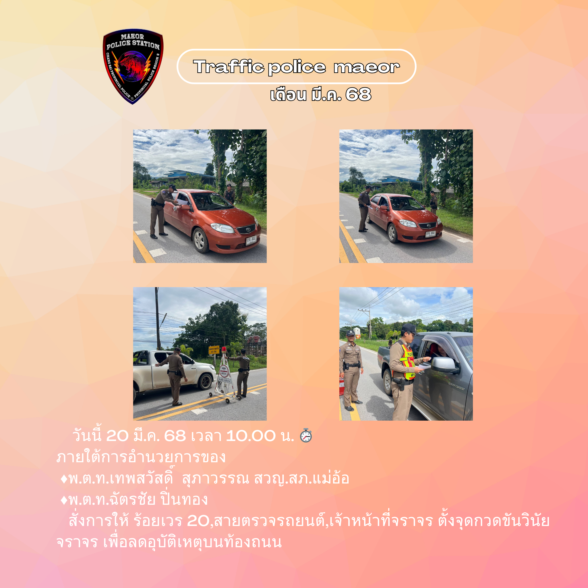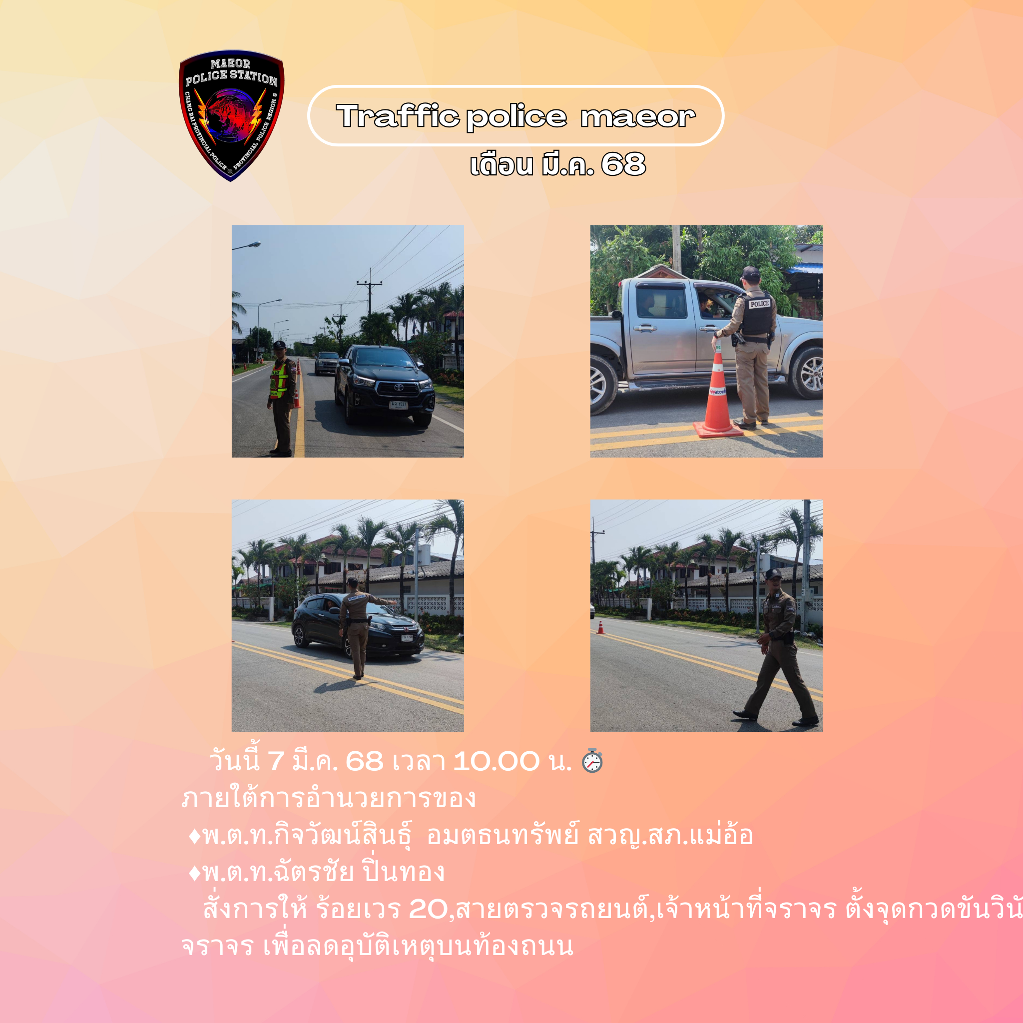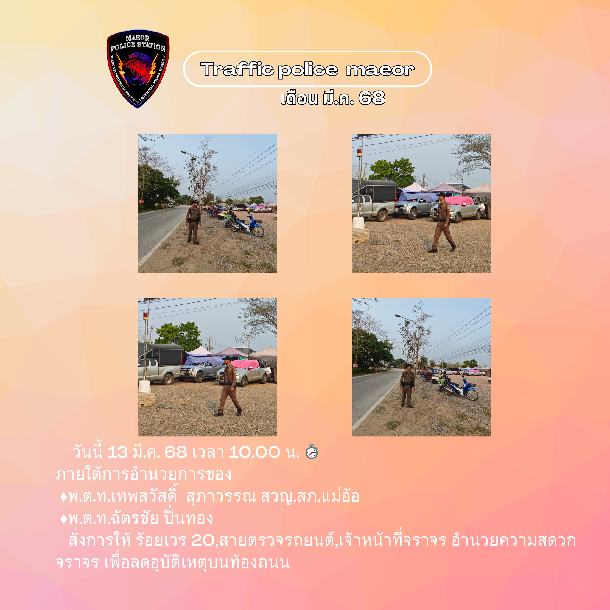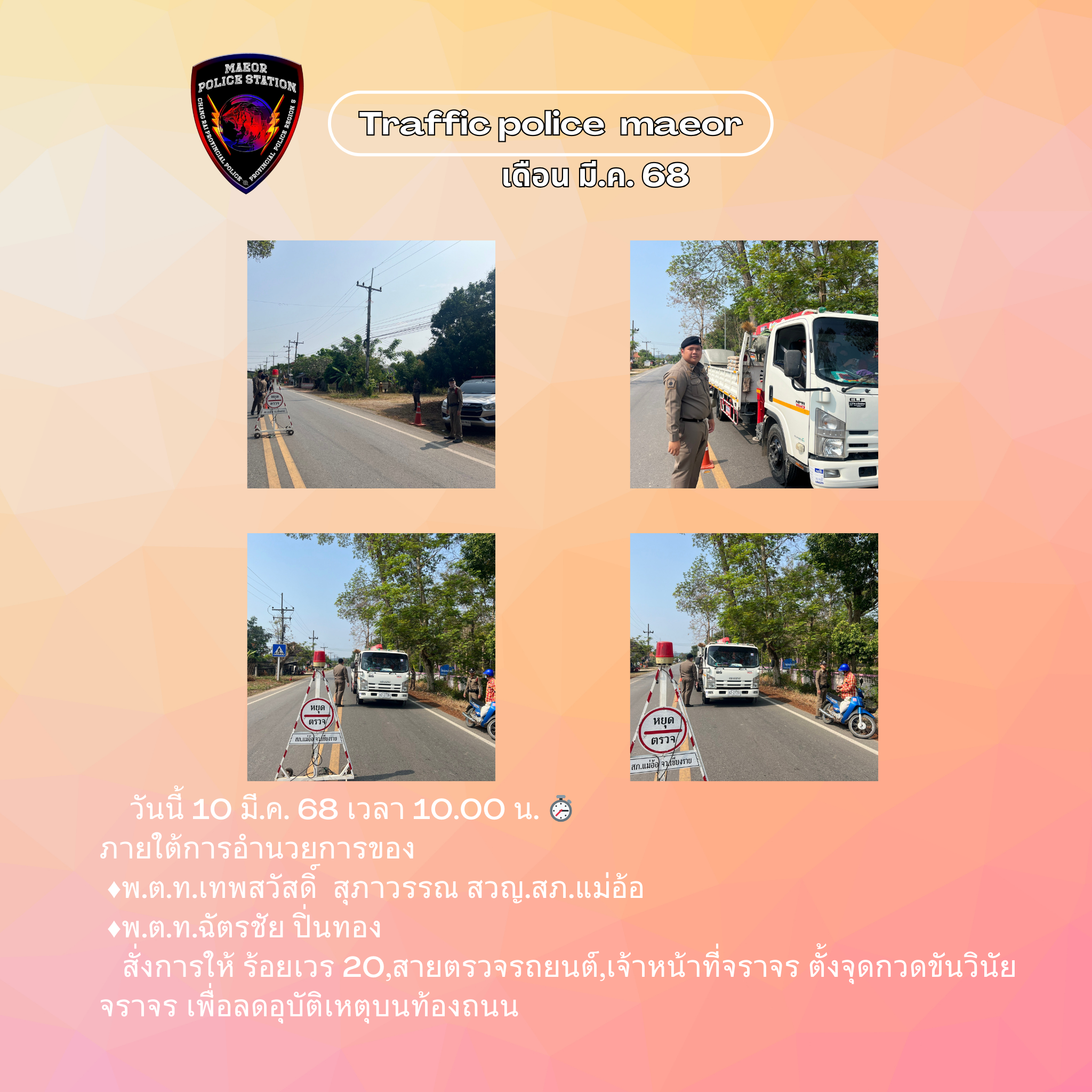 วันที่ 21 มีนาคม 2568 เวลา 10.00 น. พันตำรวจโท เทพสวัสดิ์ สุภาวรรณ สารวัตรใหญ่สถานีตำรวจแม่อ้อ เ